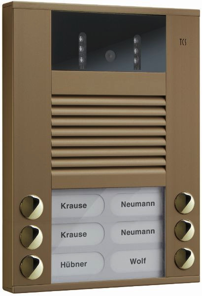für 6 Wohneinheiten, Kamerafeld: H 38 mm x B 82 mm, color-Kamera CMOS-Sensor 380 TVL, IR-Beleuchtung für Nahfeldausleuchtung, automatische Tag / Nachtumschaltung, Brennweite: f = 2,0 mm (F2,5), Lichtempfindlichkeit 0 Lux (IR ON), 1 Lux (IR OFF), diagonaler Erfassungswinkel in 130 Grad, empfohlene Montagehöhe für die Kameraposition 1,6 m, Videoausgang symmetrisch 1 Vss FBAS, basiert auf dem TCS-Videosystem in 6-Draht-Technik, Eingangsstrom: I(a) = 0,4 mA, I(P) = 60 mA in Ruhe, maximaler Eingangsstrom: I(Pmax) = 80 mA, zulässige Umgebungstemperatur: -20 Grad C bis 50 Grad C, Farbe: Aluminium eloxiert bronze (EB), Maße: H 185 mm x B 135 mm x T 20 mm