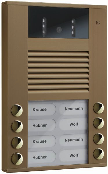 für 8 Wohneinheiten, Kamerafeld: H 38 mm x B 82 mm, color-Kamera CMOS-Sensor 380 TVL, IR-Beleuchtung für Nahfeldausleuchtung, automatische Tag / Nachtumschaltung, Brennweite: f = 2,0 mm (F2,5), Lichtempfindlichkeit 0 Lux (IR ON), 1 Lux (IR OFF), diagonaler Erfassungswinkel in 130 Grad, empfohlene Montagehöhe für die Kameraposition 1,6 m, Videoausgang symmetrisch 1 Vss FBAS, basiert auf dem TCS-Videosystem in 6-Draht-Technik, Eingangsstrom: I(a) = 0,4 mA, I(P) = 60 mA in Ruhe, maximaler Eingangsstrom: I(Pmax) = 80 mA, zulässige Umgebungstemperatur: -20 Grad C bis 50 Grad C, Farbe: Aluminium eloxiert bronze (EB), Maße: H 204 mm x B 135 mm x T 20 mm