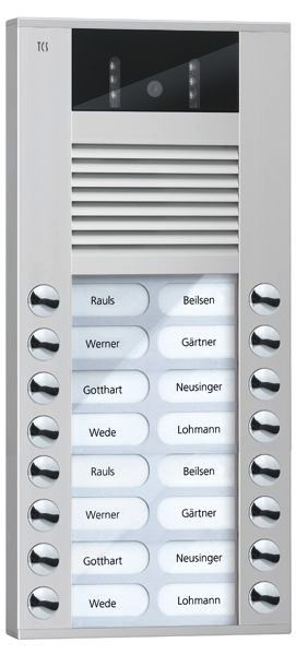 für 16 Wohneinheiten, Kamerafeld: H 38 mm x B 82 mm, color-Kamera CMOS-Sensor 380 TVL, IR-Beleuchtung für Nahfeldausleuchtung, automatische Tag / Nachtumschaltung, Brennweite: f = 2,0 mm (F2,5), Lichtempfindlichkeit 0 Lux (IR ON), 1 Lux (IR OFF), diagonaler Erfassungswinkel in 130 Grad, empfohlene Montagehöhe für die Kameraposition 1,6 m, Videoausgang symmetrisch 1 Vss FBAS, basiert auf dem TCS-Videosystem in 6-Draht-Technik, Eingangsstrom: I(a) = 0,4 mA, I(P) = 60 mA in Ruhe, maximaler Eingangsstrom: I(Pmax) = 80 mA, zulässige Umgebungstemperatur: -20 Grad C bis 50 Grad C, Farbe: Aluminium eloxiert natur, Maße: H 280 mm x B 135 mm x T 20 mm