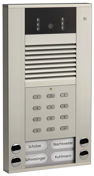 für 4 Wohneinheiten, Aufputzmontage, Produkttiefe 20 mm, Metallgehäuse aus robusten Aluminiumprofilen, Metallklingelknöpfe mit vergoldeten, wartungsfreien Kontakten, jeder Klingeltaste können 2 Innenstationen zugeordnet werden, langlebige und energiesparende Namensschildbeleuchtung, bruchsicheres Namensschildglas, Quittungston beim Drücken der Klingeltaste, PES-Funktionen einstellbar mit Konfigurationssoftware configo (außer Klingeltastenprogrammierung), Gesprächszeit ab Werk: 56 Sekunden / mit Servicegerät einstellbar, beliebige Klingeltaste zum Lichteinschalten nutzbar, Lautstärke und Mikrofonempfindlichkeit sind manuell einstellbar, steckbarer Speicher zum Austausch baugleicher Außenstationen, R-Klemme zum Anschluss einer Funktionserweiterung Türöffnen, Türöffnerzeit an R-Klemme ab Werk: 3 Sekunden / mit Servicegerät einstellbar, Türbereitschaftszeit (zur Steuerung der Kurzzeitspeicherung in Innenstationen) ab Werk: 56 Sekunden / mit Servicegerät einstellbar, Sprechverbindung in der Türbereitschaftszeit / mit Servicegerät einstellbar, Material / Farben: Aluminium eloxiert natur (EN), Schutzart IP44, Eingangsstrom I(a) = 0,6 mA, I(P) = 80 mA, Maximaler Eingangsstrom I(Pmax) = 100 mA, Maße: H von 242 mm x B 135 mm x T 20 mm, zulässige Umgebungstemperatur: -20 Grad C bis 50 Grad C, Video-Eigenschaften, Kamerafeld: H 38 mm x B 82 mm, color-Kamera CMOS-Sensor 380 TVL, Brennweite: f = 2,0 mm (F2,5), Lichtempfindlichkeit 0 Lux (IR ON), 1 Lux (IR OFF), IR-Beleuchtung für Nahfeldausleuchtung, automatische Tag / Nachtumschaltung, diagonaler Erfassungswinkel 130Grad , empfohlene Montagehöhe für die Kameraposition 1,6 m, Videoausgang symmetrisch 1 Vss FBAS, basiert auf dem TCS-Videosystem in 6-Draht-Technik, Codeschloss-Eigenschaften, 10 Zugangscodes (max. 8-stellig) mit individuellen Auslösefunktionen, Senden von TCS-Protokollen Türöffner, Steuerfunktion, ein Mastercode (max. 8-stellig) zur Wartung und Konfiguration, Programmierung manuell, Akzeptanz führender Nullen in Zugangscodes, Eingabe Zugangscode ohne Abschluss durch # -Taste, Lichtschaltprotokoll senden bei Drücken der # -Taste, LED zur Statusanzeige, optische und akustische Quittung bei Codeeingabe, Optische und akustische Fehlersignalisierung, Akustische Tastenquittierung, Schalteingang, zweipolige steckbare Schraubklemme für externen potentialfreien Kontakt, der Schalteingang ist konfigurierbar und beeinflusst die Wirksamkeit des Codes auf Speicherplatz Nr.1 (Codeabstell- bzw. Briefträgerfunktion), Erweiterungsbuchse zum Anschluss der Klingeltastenerweiterung oder des Servicegerätes, Material, Farbe Tastaturraum: Aluminium eloxiert natur, Höhe Codeschloss 76mm,