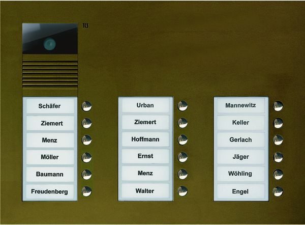 | Kurzbeschreibung | Video Außenstation Serie AVU mit 18 Klingeltasten (rechtsbündig), 3-spaltig, UP bronze |