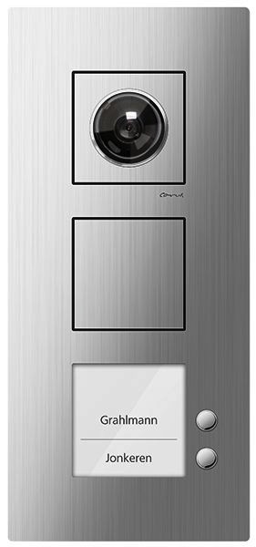 | Kurzbeschreibung | Video Außenstation Serie Carus IRIS mit 2 Klingeltasten (rechtsbündig), AP silber |