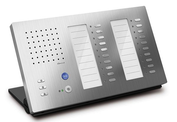 Carus Adapto Audio Innenstation mit 20 Funktionstasten, Tischgerät, Gehäuse aus massivem Aluminium, handveredelte Strukturoberfläche, Tasten laserbeschriftet aus eloxiertem Aluminium, Farbe: Silber, Tischfuß mit stufenlos einstellbarem Neigungswinkel schwarz eloxiert, incl. 2,5m Kabel (schwarz mit RJ45 Stecker), Freisprechen (hands-free) / manuell gesteuertes Wechselsprechen aktivierbar, automatisches Freisprechen nach Internruf aktivierbar, blaue Türöffnertaste mit aktivierbarer Etagentüröffnerfunktion, Taste für Rufannahme bzw. Umschalttaste Sprechen / Hören, wenn Wechselsprechen aktiviert, Lichttaste, 1 Funktionstaste ab Werk: mit Steuerfunktion belegt, aktivierbare Alternativbelegung: Internruf, Türöffnerautomatik, Rufumleitung, Auswahl aus 13 Ruftönen, akustische und optische Rufunterscheidung zwischen Haus-, Wohnungstür und Internruf, akustische Türrufunterscheidung für 2 Türen, Ruftonlautstärke / manuell einstellbar, Ruftonabschaltung mit optischer Anzeige, 1 Parallelruf aktivierbar, optische Kurzzeitspeicherung von Türrufen, optische Besetztanzeige bei bestehender Sprechverbindung, Mithörsperre und automatische Gesprächsabschaltung, 20 Funktionstasten ab Werk: mit Steuerfunktion belegt / aktivierbare Alternativbelegung: gezielter Internruf, gezieltes Türsprechen, gezieltes Türöffnen, Rufumleitung, Zustandsanzeige, Sensor mit Binäreingang, abwechselnde Steuerfunktion (Ein / Aus), PTZ Kamera Positionen, ausziehbares Beschriftungsfeld, Audio- und Video-Innenstationen sind innerhalb einer Anlage kombinierbar, 3-Draht-Technik erforderlich