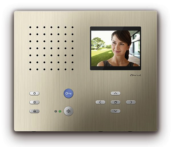 Carus Adapto, Metallmonitor in color, Aufputzmontage mit UP-Dose, Gehäuse aus massivem Aluminium, handveredelte Strukturoberfläche, Tasten laserbeschriftet aus eloxiertem Aluminium, Farbe: champagner, basiert auf dem TCS-Videosystem in 6-Draht-Technik, Audio- und Video-Innenstationen sind innerhalb einer Anlage kombinierbar, Freisprechen (hands-free) / manuell gesteuertes Wechselsprechen aktivierbar, automatisches Freisprechen nach Internruf aktivierbar , blaue Türöffnertaste mit aktivierbarer Etagentüröffnerfunktion, Lichttaste, 1 Funktionstaste ab Werk: mit Steuerfunktion belegt / aktivierbare Alternativbelegung: Internruf, Türöffnerautomatik, Rufumleitung, Auswahl aus 13 Ruftönen, akustische und optische Rufunterscheidung zwischen Haus-, Wohnungstür und Internruf, akustische Türrufunterscheidung für 2 Türen, Ruftonlautstärke / manuell einstellbar, Ruftonabschaltung mit optischer Anzeige, 1 Parallelruf aktivierbar, optische Kurzzeitspeicherung von Türrufen, optische Besetztanzeige bei bestehender Sprechverbindung, Mithörsperre und automatische Gesprächsabschaltung, Monitor in color mit digitalem TFT-Display, Bildschirmdiagonale 8,9 cm (3,5 Zoll), Auflösung: 320 x 240 Pixel, Bildtaste zum Einschalten des Bildes bzw. zum Umschalten, zwischen verschiedenen Kameras, 4 Steuertasten (rechts, links, auf, ab) zur Steuerung von PTZ Kameras, Helligkeit, Farbsättigung / manuell einstellbar