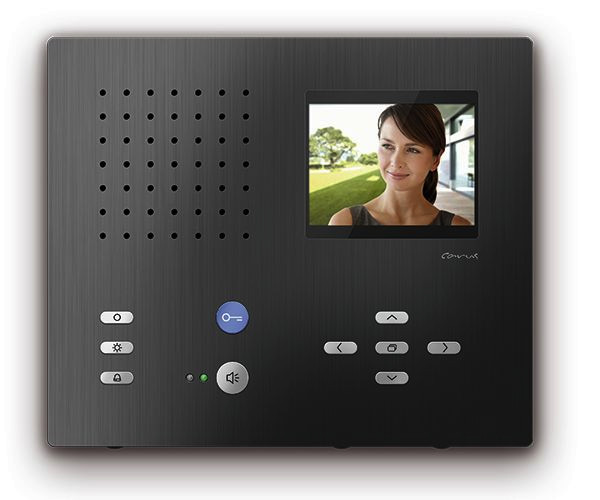Carus Adapto, Metallmonitor in color, Aufputzmontage mit UP-Dose, Gehäuse aus massivem Aluminium, handveredelte Strukturoberfläche, Tasten laserbeschriftet aus eloxiertem Aluminium, Farbe: schwarz, basiert auf dem TCS-Videosystem in 6-Draht-Technik, Audio- und Video-Innenstationen sind innerhalb einer Anlage kombinierbar, Freisprechen (hands-free) / manuell gesteuertes Wechselsprechen aktivierbar, automatisches Freisprechen nach Internruf aktivierbar , blaue Türöffnertaste mit aktivierbarer Etagentüröffnerfunktion, Lichttaste, 1 Funktionstaste ab Werk: mit Steuerfunktion belegt / aktivierbare Alternativbelegung: Internruf, Türöffnerautomatik, Rufumleitung, Auswahl aus 13 Ruftönen, akustische und optische Rufunterscheidung zwischen Haus-, Wohnungstür und Internruf, akustische Türrufunterscheidung für 2 Türen, Ruftonlautstärke / manuell einstellbar, Ruftonabschaltung mit optischer Anzeige, 1 Parallelruf aktivierbar, optische Kurzzeitspeicherung von Türrufen, optische Besetztanzeige bei bestehender Sprechverbindung, Mithörsperre und automatische Gesprächsabschaltung, Monitor in color mit digitalem TFT-Display, Bildschirmdiagonale 8,9 cm (3,5 Zoll), Auflösung: 320 x 240 Pixel, Bildtaste zum Einschalten des Bildes bzw. zum Umschalten, zwischen verschiedenen Kameras, 4 Steuertasten (rechts, links, auf, ab) zur Steuerung von PTZ Kameras, Helligkeit, Farbsättigung / manuell einstellbar