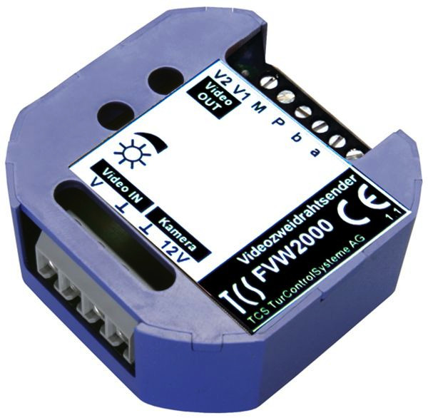 Videozweidrahtsender für die Montage in Standard-Schalterdosen bzw. Verteiler-Dosen, dient zur Einspeisung von fremden Videoquellen ( Kameras, CCTV usw.) an das TCS:Videosystem, wandelt ein (F)BAS-Signal (composite video) in ein Zweidrahtsignal um, über einen Regler kann bei Bedarf ein Abgleich des Videopegels erfolgen, so können z. B. Dämpfungen auf der Anschlussleitung ausgeglichen werden, Anschluss über Schraubklemmen, Betriebsspannung: 26 V DC (aus P-Ader), Stromaufnahme: max. 300 mA, Eingangsimpedanz: 75 Ohm unsymmetrisch, Ausgangsimpedanz: 100 Ohm symmetrisch, Regelbereich Videopegel: -12 dB bis + 4 dB, Kameraversorgung: 12 DC max. 125 mA, Farbe: blau, Maße: H 51 mm x B 51 mm x T 22 mm