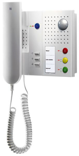 AP-Montage / aufstellbar (Tischzubehör), Gegensprechen, Gehäuse aus antistatischem und recycelbarem Kunststoff, blaue Türöffnertaste mit aktivierbarer Etagentüröffnerfunktion, Lichttaste, 1 Funktionstaste ab Werk: mit Steuerfunktion belegt / aktivierbare , Alternativbelegung: Internruf, Türöffnerautomatik, Rufumleitung, Auswahl aus 13 Ruftönen, akustische und optische Rufunterscheidung zwischen Haus-, Wohnungstür und Internruf, akustische Türrufunterscheidung f. 2 Türen, Ruftonlautstärke / manuell einstellbar, Ruftonabschaltung mit optischer Anzeige, 1 Parallelruf aktivierbar, optische Kurzzeitspeicherung von Türrufen, optische Besetztanzeige bei bestehender Sprechverbindung, Mithörsperre und automatische Gesprächsabschaltung, Audio- und Video-Innenstationen sind innerhalb einer Anlage kombinierbar, 3 farbige Tasten (rot, gelb grün) zum optionalen Senden verschiedener Steuerfunktionen , Funktionstaste rot: akustische Raumüberwachung aktivieren, Internruf 3, Steuerfunktion 10 Funktionstaste gelb: Steuerfunktion 1 / Steuerfunktion 2 (im Wechsel, = rastende Steuerfunktion), Internruf 2, Licht schalten, Funktionstaste grün: Steuerfunktion 8, Internruf 1, Rufumleitung, 3 LED’s zur Zustandsanzeige, den Tasten zugeordnet, Beschriftungsfeld, Bewegungssensor zum Erkennen von längeren Aktivitätspausen im Erfassungsbereich - sendet steuerfunktion nach einstellbarer Zeit (15min-63 h, deaktivierbar), Empfindlichkeit einstellbar, Optische Signalisierung eingehender Rufe und Durchsagen (helle LED), Mikrofon f. Raumüberwachung, Empfindlichkeit einstellbar, in den Raum hineinhören und -sprechen: nur in Verbindung mit Anwenderprogramm Rufzentrale PCSWxxxx oder Pförtnerstationen PFSxx-EN möglich., Anschlussklemme f. externen Taster, Optional Ausstattung mit Funkempfangsplatine (0022930 / RRM02-5001AS-02), zur Rufauslösung, Ansteuerung durch Funksensor, 1-Kanal, Armband (0022931 / RT26-5001C-02.0-06), Ansteuerung durch Funksensor, 1-Kanal, Halsband (0022932 / RT27-5001C-01.0-06), Ansteuerung durch maximal 5 Funksensoren möglich, Bei der Planung muss bedacht werden, dass eine Funkübertragung räumlich begrenzt oder gestört sein kann!, Hinweis: Die Innenstation IMM1500 darf nicht in Rufanlagen nach DIN VDE 0834 und EN50134 verwendet werden. Entsprechend DIN 77800 muss eine gesonderte Notrufsicherung eingerichtet werden. Die mit einer Innenstation mit Sonderfunktionen ausgestattete Anlage stellt keine Notrufanlage im Sinne vorgenannter Normen dar. Die Innenstation mit Sonderfunktionen darf nicht in lebensrettenden oder lebenserhaltenden Systemen eingesetzt werden. Auch die Kombination mit Anlagenteilen, die vorgenannte. Normen erfüllen, ist unzulässig., Farbe: weiß, 3-Draht-Technik erforderlich, Eingangsstrom: I(a) = 0,42 mA, I(P) = 12,2 mA in Ruhe, maximaler Eingangsstrom: I(Pmax) = 87,7 mA, zulässige Umgebungstemperatur: -5 Grad C bis 40 Grad C, Gehäusemaß (H/B/T): 215x172x43mm