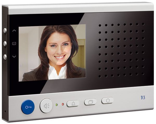 Sky Video-Innenstation. TFT-Display Bildschirmdiagonale 8,9cm (3,5 Zoll). Auflösung color: 320 x 240 Pixel. Gehäuse: Frontplatte aus Acryl, Metallstrangguss Aluminium eloxiert. Freisprechen (hands-free) / manuell gesteuertes Wechselsprechen aktivierbar. Blaue Türöffnertaste . Taste für Rufannahme bzw. Umschalttaste Sprechen / Hören, wenn Wechselsprechen aktiviert. 1 Funktionstaste mit optischer Anzeige, ab Werk: mit Steuerfunktion belegt / aktivierbare Alternativbelegung: Internruf, Türöffnerautomatik, Rufumleitung, Licht, Steuerfunktionsmenü oder Internrufmenü aufrufen / mit configo einstellbar. Bildtaste zum Einschalten des Bildes bzw. zum Umschalten zwischen verschiedenen Kameras. Menütaste zur Aktivierung, Steuerung des OSD Menü. 2 Cursortasten zur OSD Navigation und Einstellung. Auswahl aus 13 polyphonen Ruftönen, über OSD einstellbar. akustische und optische Rufunterscheidung zwischen Haus-, Wohnungstür und Internruf. Akustische Türrufunterscheidung je Klingeltaste 4 unterschiedliche Ruftöne. Akustische Türrufunterscheidung für 2 Türen. Ruftonabschaltung mit optischer Anzeige. OSD basierte Auslösung von max. 10 Internrufen und max. 10 Steuerfunktionen mit Bezeichnung / mit configo einstellbar. OSD basierte Bedienung des zentralen Bildspeichers (FVM1000). Ruftonlautstärke in 8 Stufen über OSD einstellbar. Sprechenlautstärke in 8 Stufen über OSD einstellbar. Helligkeit, Kontrast, Farbsättigung über OSD einstellbar. 1 Parallelruf / mit configo aktivierbar. Empfang und Anzeige von max. 10 Kurzmitteilungen . Optische Anzeige für neu aufgezeichnete Bilder im zentralen Bildspeicher (FVM1000). Optische Kurzzeitspeicherung von Türrufen. Optische Besetztanzeige bei bestehender Sprechverbindung. Optische Anzeige ungelesener Kurzmitteilungen. Anschluss für Etagentaster am Gerät vorhanden. Mithörsperre und automatische Gesprächsabschaltung. Audio- und Video-Innenstationen sind innerhalb einer Anlage kombinierbar. Basiert auf dem TCS-Videosystem in 6-Draht-Technik. Technische Daten. Zulässige Umgebungstemperatur: -5 Grad C bis 40 Grad C. Geprüft nach EN 50486. Farbe: silber. Montage auf Unterputzdose zwingend erforderlich. Gehäusemaß: H 104 mm x B 153 mm x T 16 mm. Montagemaß: H 104 mm x B 163 mm x T 20 mm.