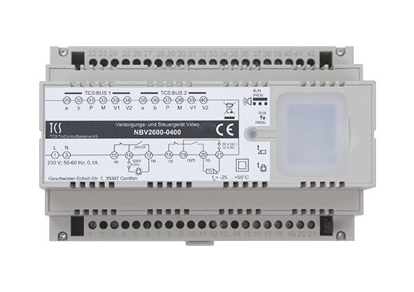 Versorgungs- und Steuergerät für Audio- und Videoanlagen mit erhöhten Ausgangsströmen an P und a, Produktmerkmale: Gehäuse mit klappbarem transparentem Deckel, Erweiterter Sicherheitsmodus ein/aus, bis zu 20 Seriennummern von Innenstationen konfigurierbar, Konformität REACH, WEEE, RoHS, Technische Daten: Montageform 1: Hutschiene/DIN-Schiene / 8 TE, Geräteart: Versorgungs- und Steuergerät für Audio- und Videoanlagen mit erhöhten Ausgangsströmen an P und a, Kommunikationstechnologie: TCS:BUS, Türöffnen anstelle Lichtschaltfunktion: mit configo einstellbar, Lichtschalten: Lichtschalt-Ausgang potentialfrei (COM, NO, NC), max. Belastbarkeit max. 36VDC, 3A,Türöffnen: Anschluss Türöffner Ausgang für Wechsel-/Gleichspannungstüröffner ( :6 Ohm) und Ausgang geschaltet und potenzialfrei. Türöffner-Ausgang potenzialfrei (COM, NO, NC), max. 24V DC, 2,5 A, potentialfreier Relaiskontakt: 1, Anzahl potentialfreier Relaiskontakte: 2, Programmiertaste: 1, Anschluss Servicegerät: Anschluss für Servicegerät, Betriebsanzeige: LED (grün), Fehleranzeige: 7-Segment LED (rot), Anschluss Türöffner: Gleichspannungs- oder Wechselspannungstüröffner (wählbar) mit Jumper AC-DC-potentialfrei umschaltbar. Türöffnerversorgung (AC / DC), (:6O) 12V AC 50 Hz, 1,0 A oder 26 V DC, 0,5 A; 4 Klemmen (NC, COM Spannung +, NO, Spannung -)