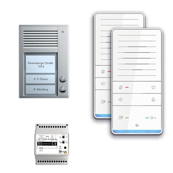 Vorkonfiguriertes Paket für 2 Wohneinheiten für den TCS:BUS bestehend aus: 1x Außenstation PAK 2Tasten AP EN, Artikelnummer: PAK02-EN, vorprogrammiert, 2x TASTA Freisprecher AUDIO PLUS WS, Artikelnummer: ISW6031-0145, 1x Vers. + Steuerg. BVS20 1Strang 4TE, Artikelnummer: BVS20-SG, Das Paket ist ab Werk vorkonfiguriert und bedingt erweiterbar. Die Funktionen der Innen- und Außenstationen können mit TCS-Serviceprodukten bedingt verändert werden, Die Komponenten unterstützen einen stand-alone-Betrieb