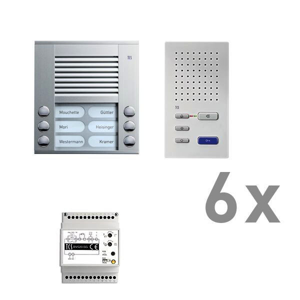 Vorkonfiguriertes Paket für 6 Wohneinheiten für den TCS:BUS bestehend aus: 1x Außenstation PES 6Tasten AP EN LED WS, Artikelnummer: PES06-EN/04, vorprogrammiert, 6x Innenstation zum Freispr. 5Tasten WS, Artikelnummer: ISW3030-0140, 1x Vers. + Steuerg. BVS20 1Strang 4TE, Artikelnummer: BVS20-SG, Das Paket ist ab Werk vorkonfiguriert und bedingt erweiterbar. Die Funktionen der Innen- und Außenstationen können mit TCS-Serviceprodukten bedingt verändert werden, Die Komponenten unterstützen einen stand-alone-Betrieb