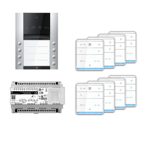 Vorkonfiguriertes Paket für 8 Wohneinheiten für den TCS:BUS bestehend aus: 1x PES PRO Audio Außenstation 8T AP EN, Artikelnummer: ASA110208-0010, vorprogrammiert, 8x TASTA Freisprecher 6Tasten AP WS SDI, Artikelnummer: ISW6010-0145, 1x Versorgungs- und Steuergerät Video 8 TE, Artikelnummer: NBV2600-0400. Das Paket ist ab Werk vorkonfiguriert und bedingt erweiterbar. Die Funktionen der Innen- und Außenstationen können mit TCS-Serviceprodukten bedingt verändert werden.