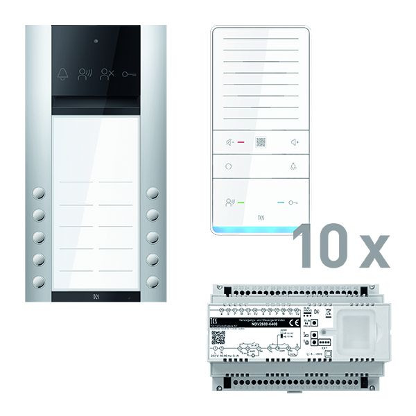 Vorkonfiguriertes Paket für 10 Wohneinheiten für den TCS:BUS bestehend aus: 1x PES PRO Audio Außenstation 10T AP EN, Artikelnummer: ASA110210-0010, vorprogrammiert, 10x TASTA Freisprecher AUDIO PLUS WS SDI, Artikelnummer: ISW6031-0145, 1x Versorgungs- und Steuergerät Video 8 TE, Artikelnummer: NBV2600-0400, das Paket ist ab Werk vorkonfiguriert und bedingt erweiterbar. Die Funktionen der Innen- und Außenstationen können mit TCS-Serviceprodukten bedingt verändert werden.
