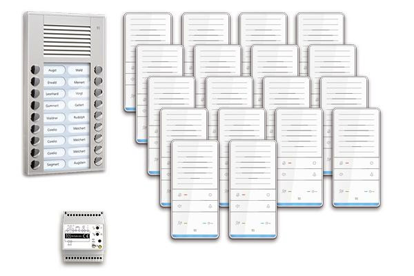 Vorkonfiguriertes Paket für 18 Wohneinheiten für den TCS:BUS bestehend aus: 1x Außenstation PES 18Tasten AP EN LED WS, Artikelnummer: PES18-EN/04, vorprogrammiert, 18x TASTA Freisprecher AUDIO PLUS WS, Artikelnummer: ISW6031-0145, 1x Vers. + Steuerg. BVS20 1Strang 4TE, Artikelnummer: BVS20-SG, Das Paket ist ab Werk vorkonfiguriert und bedingt erweiterbar, Die Funktionen der Innen- und Außenstationen können mit TCS-Serviceprodukten bedingt verändert werden, Die Komponenten unterstützen einen stand-alone-Betrieb
