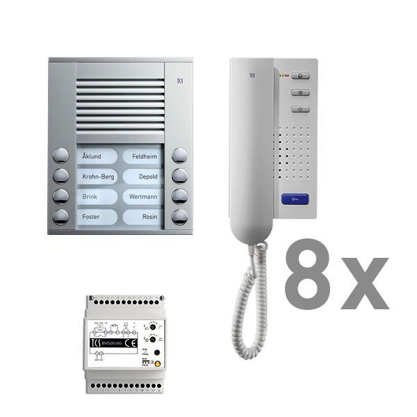 Vorkonfiguriertes Paket für 8 Wohneinheiten für den TCS:BUS bestehend aus: 1x Außenstation PES 8Tasten AP EN LED WS, Artikelnummer: PES08-EN/04, vorprogrammiert, 8x Türtelefon 4Tasten WS, Artikelnummer: ISH3030-0140, 1x Vers. + Steuerg. BVS20 1Strang 4TE, Artikelnummer: BVS20-SG, Das Paket ist ab Werk vorkonfiguriert und bedingt erweiterbar, Die Funktionen der Innen- und Außenstationen können mit TCS-Serviceprodukten bedingt verändert werden, Die Komponenten unterstützen einen stand-alone-Betrieb