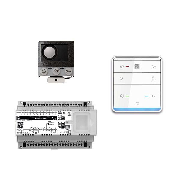 Vorkonfiguriertes Paket für 1 Wohneinheit für den TCS:BUS bestehend aus: 1x Einbau-Türlautsprecher (Serie TCU) 16WE, Artikelnummer: ASI12000-0000, vorprogrammiert, 1x TASTA PRO Freisprecher 6Tasten AP WS SDI, Artikelnummer: ISW6010-0145, 1x Versorgungs- und Steuergerät Video 8 TE, Artikelnummer: NBV2600-0400, Das Paket ist ab Werk vorkonfiguriert und bedingt erweiterbar. Die Funktionen der Innen- und Außenstationen können mit TCS-Serviceprodukten bedingt verändert werden. Die Komponenten unterstützen einen stand-alone-Betrieb.