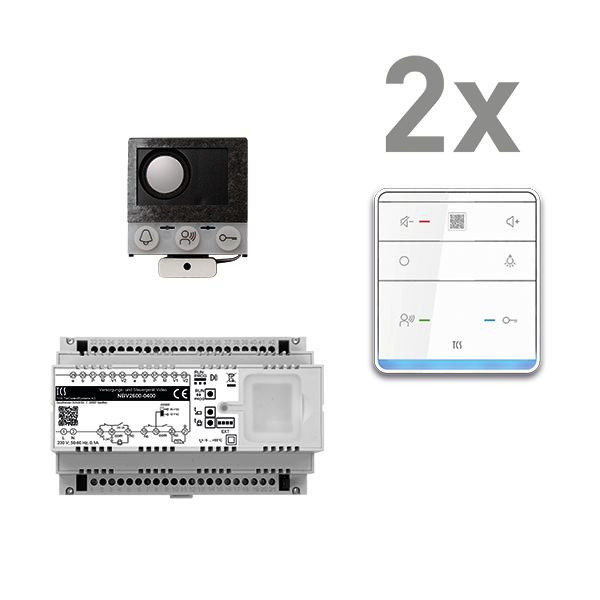 Vorkonfiguriertes Paket für 2 Wohneinheiten für den TCS:BUS bestehend aus: 1x Einbau-Türlautsprecher (Serie TCU) 16WE, Artikelnummer: ASI12000-0000, vorprogrammiert, 2x TASTA PRO Freisprecher 6Tasten AP WS SDI, Artikelnummer: ISW6010-0145, 1x Versorgungs- und Steuergerät Video 8 TE, Artikelnummer: NBV2600-0400, Das Paket ist ab Werk vorkonfiguriert und bedingt erweiterbar. Die Funktionen der Innen- und Außenstationen können mit TCS-Serviceprodukten bedingt verändert werden. Die Komponenten unterstützen einen stand-alone-Betrieb.