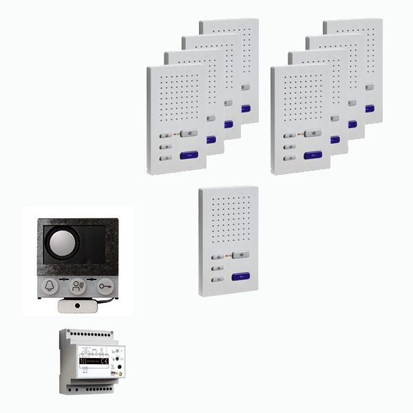 Vorkonfiguriertes Paket für 9 Wohneinheiten für den TCS:BUS bestehend aus: 1x Einbau-Türlautsprecher (Serie TCU) 16WE, Artikelnummer: ASI12000-0000, vorprogrammiert, 9x Innenstation zum Freispr. 5Tasten WS, Artikelnummer: ISW3030-0140, 1x Vers. + Steuerg. BVS20 1Strang 4TE, Artikelnummer: BVS20-SG, Das Paket ist ab Werk vorkonfiguriert und bedingt erweiterbar, Die Funktionen der Innen- und Außenstationen können mit TCS-Serviceprodukten bedingt verändert werden, Die Komponenten unterstützen einen stand-alone-Betrieb
