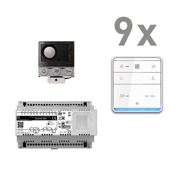 Vorkonfiguriertes Paket für 9 Wohneinheiten für den TCS:BUS bestehend aus: 1x Einbau-Türlautsprecher (Serie TCU) 16WE, Artikelnummer: ASI12000-0000, vorprogrammiert, 9x TASTA PRO Freisprecher 6Tasten AP WS SDI, Artikelnummer: ISW6010-0145, 1x Versorgungs- und Steuergerät Video 8 TE, Artikelnummer: NBV2600-0400, Das Paket ist ab Werk vorkonfiguriert und bedingt erweiterbar. Die Funktionen der Innen- und Außenstationen können mit TCS-Serviceprodukten bedingt verändert werden. Die Komponenten unterstützen einen stand-alone-Betrieb.
