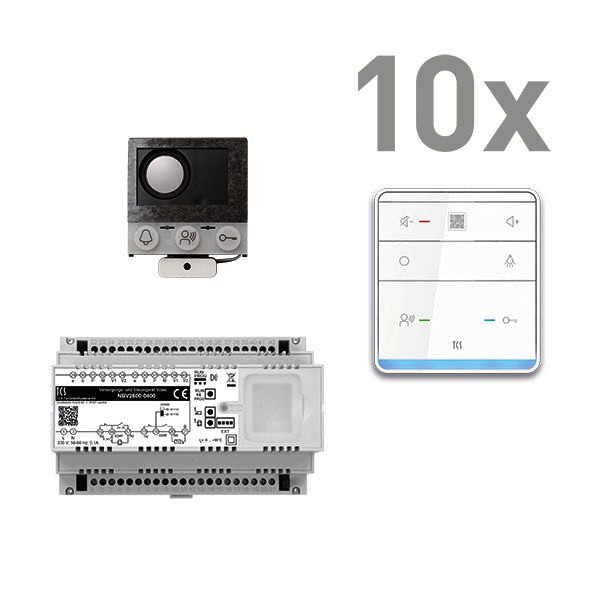 Vorkonfiguriertes Paket für 10 Wohneinheiten für den TCS:BUS bestehend aus: 1x Einbau-Türlautsprecher (Serie TCU) 16WE, Artikelnummer: ASI12000-0000, vorprogrammiert, 10x TASTA PRO Freisprecher 6Tasten AP WS SDI, Artikelnummer: ISW6010-0145, 1x Versorgungs- und Steuergerät Video 8 TE, Artikelnummer: NBV2600-0400, Das Paket ist ab Werk vorkonfiguriert und bedingt erweiterbar. Die Funktionen der Innen- und Außenstationen können mit TCS-Serviceprodukten bedingt verändert werden. Die Komponenten unterstützen einen stand-alone-Betrieb.