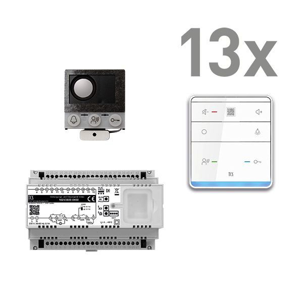 Vorkonfiguriertes Paket für 13 Wohneinheiten für den TCS:BUS bestehend aus: 1x Einbau-Türlautsprecher (Serie TCU) 16WE, Artikelnummer: ASI12000-0000, vorprogrammiert, 13x TASTA PRO Freisprecher 6Tasten AP WS SDI, Artikelnummer: ISW6010-0145, 1x Versorgungs- und Steuergerät Video 8 TE, Artikelnummer: NBV2600-0400, Das Paket ist ab Werk vorkonfiguriert und bedingt erweiterbar. Die Funktionen der Innen- und Außenstationen können mit TCS-Serviceprodukten bedingt verändert werden. Die Komponenten unterstützen einen stand-alone-Betrieb.