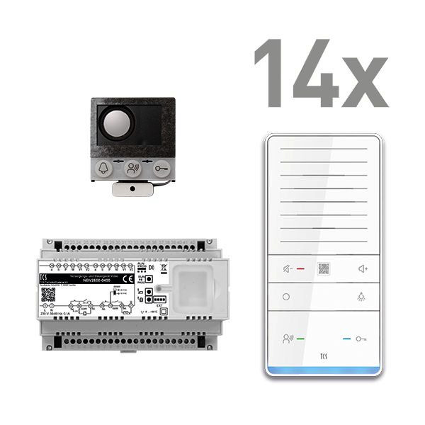Vorkonfiguriertes Paket für 14 Wohneinheit für den TCS:BUS bestehend aus: 1x Einbau-Türlautsprecher (Serie TCU) 16WE, Artikelnummer: ASI12000-0000, vorprogrammiert, 14x TASTA PRO Freisprecher PLUS WS SDI, Artikelnummer: ISW6031-0145, 1x Versorgungs- und Steuergerät Video 8 TE, Artikelnummer: NBV2600-0400. Das Paket ist ab Werk vorkonfiguriert und bedingt erweiterbar. Die Funktionen der Innen- und Außenstationen können mit TCS-Serviceprodukten bedingt verändert werden. Die Komponenten unterstützen einen stand-alone-Betrieb.