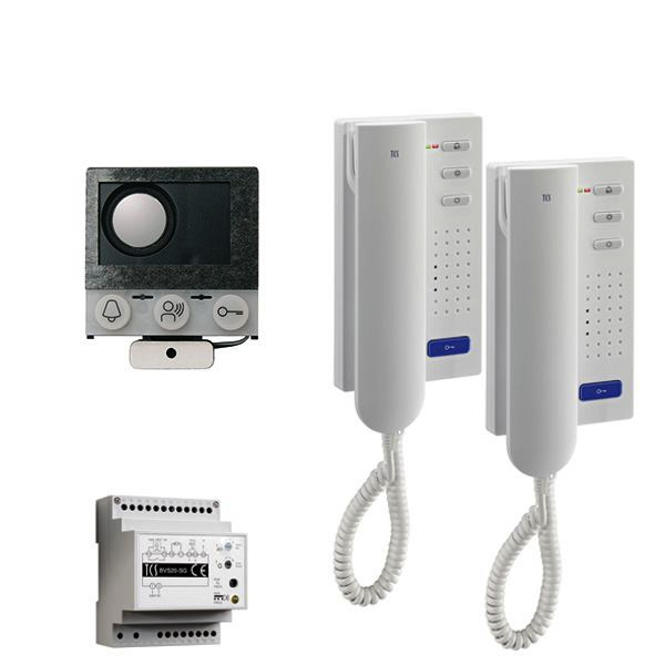 Vorkonfiguriertes Paket für 2 Wohneinheiten für den TCS:BUS bestehend aus: 1x Einbau-Türlautsprecher (Serie TCU) 16WE, Artikelnummer: ASI12000-0000, vorprogrammiert, 2x Türtelefon 4Tasten WS, Artikelnummer: ISH3030-0140, 1x Vers. + Steuerg. BVS20 1Strang 4TE, Artikelnummer: BVS20-SG, Das Paket ist ab Werk vorkonfiguriert und bedingt erweiterbar, Die Funktionen der Innen- und Außenstationen können mit TCS-Serviceprodukten bedingt verändert werden, Die Komponenten unterstützen einen stand-alone-Betrieb