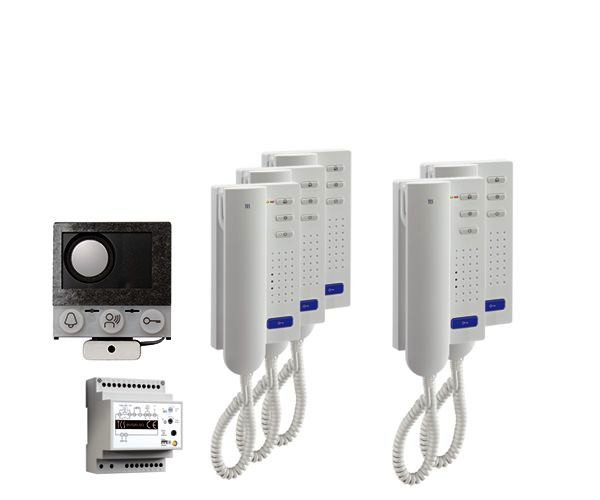 Vorkonfiguriertes Paket für 5 Wohneinheiten für den TCS:BUS bestehend aus: 1x Einbau-Türlautsprecher (Serie TCU) 16WE, Artikelnummer: ASI12000-0000, vorprogrammiert, 5x Türtelefon 4Tasten WS, Artikelnummer: ISH3030-0140, 1x Vers. + Steuerg. BVS20 1Strang 4TE, Artikelnummer: BVS20-SG, Das Paket ist ab Werk vorkonfiguriert und bedingt erweiterbar. Die Funktionen der Innen- und Außenstationen können mit TCS-Serviceprodukten bedingt verändert werden, Die Komponenten unterstützen einen stand-alone-Betrieb
