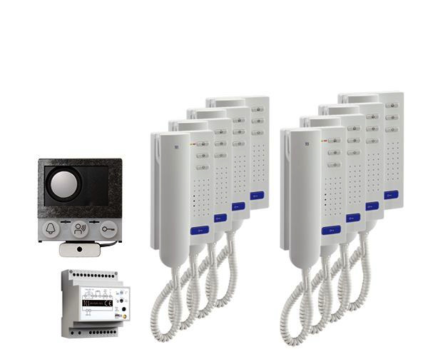 Vorkonfiguriertes Paket für 8 Wohneinheiten für den TCS:BUS bestehend aus: 1x Einbau-Türlautsprecher (Serie TCU) 16WE, Artikelnummer: ASI12000-0000, vorprogrammiert, 8x Türtelefon 4Tasten WS, Artikelnummer: ISH3030-0140, 1x Vers. + Steuerg. BVS20 1Strang 4TE, Artikelnummer: BVS20-SG, Das Paket ist ab Werk vorkonfiguriert und bedingt erweiterbar, Die Funktionen der Innen- und Außenstationen können mit TCS-Serviceprodukten bedingt verändert werden, Die Komponenten unterstützen einen stand-alone-Betrieb