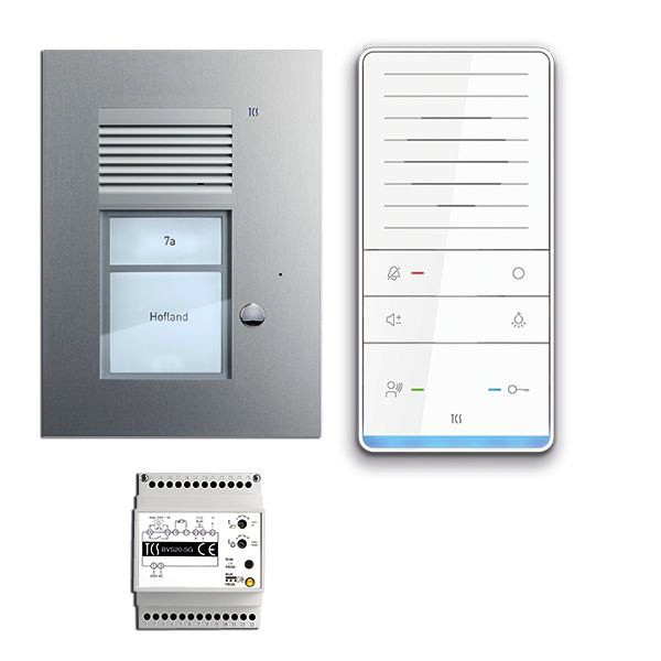 Vorkonfiguriertes Paket für 1 Wohneinheit für den TCS:BUS bestehend aus: 1x Außenstation PUK 1Taste 1 Spalte UP EN, Artikelnummer: PUK01/1-EN, vorprogrammiert, 1x TASTA Freisprecher AUDIO PLUS WS, Artikelnummer: ISW6031-0145, 1x Vers. + Steuerg. BVS20 1Strang 4TE, Artikelnummer: BVS20-SG, Das Paket ist ab Werk vorkonfiguriert und bedingt erweiterbar, Die Funktionen der Innen- und Außenstationen können mit TCS-Serviceprodukten bedingt verändert werden, Die Komponenten unterstützen einen stand-alone-Betrieb