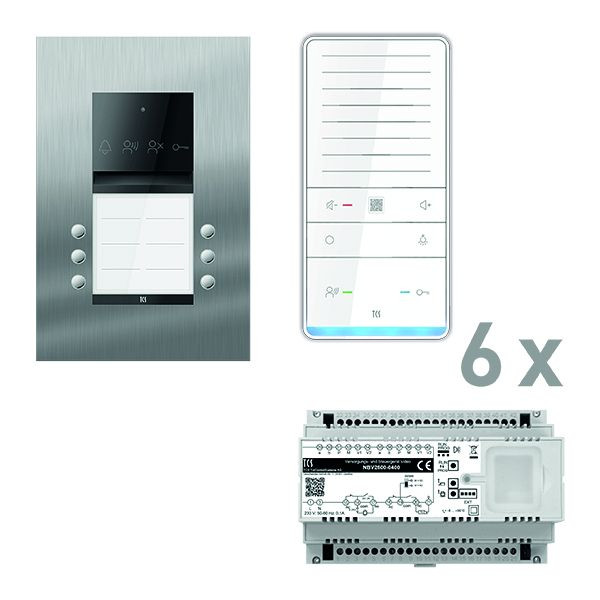 Vorkonfiguriertes Paket für 6 Wohneinheiten für den TCS:BUS bestehend aus: 1x PES PRO Audio Außenstation 6T UP ES, Artikelnummer: ASU600206-0030, vorprogrammiert, 6x TASTA Pro Freisprecher PLUS WS SDI, Artikelnummer: ISW6031-0145, 1x Versorgungs- und Steuergerät Video 8 TE, Artikel-Nr. NBV2600-0400. Das Paket ist ab Werk vorkonfiguriert und bedingt erweiterbar. Die Funktionen der Innen- und Außenstationen können mit TCS-Serviceprodukten bedingt verändert werden