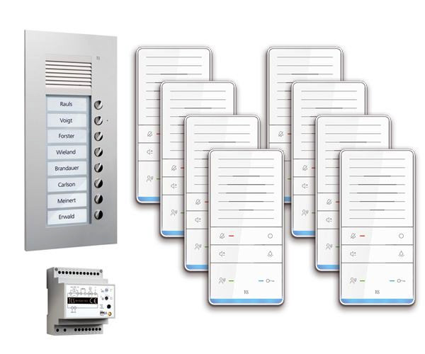 Vorkonfiguriertes Paket für 8 Wohneinheiten für den TCS:BUS bestehend aus: 1x Außenstation PUK 8Tasten 1Spalte UP EN, Artikelnummer: PUK08/1-EN, vorprogrammiert, 8x TASTA Freisprecher AUDIO PLUS WS, Artikelnummer: ISW6031-0145, 1x Vers. + Steuerg. BVS20 1Strang 4TE, Artikelnummer: BVS20-SG, Das Paket ist ab Werk vorkonfiguriert und bedingt erweiterbar, Die Funktionen der Innen- und Außenstationen können mit TCS-Serviceprodukten bedingt verändert werden, Die Komponenten unterstützen einen stand-alone-Betrieb