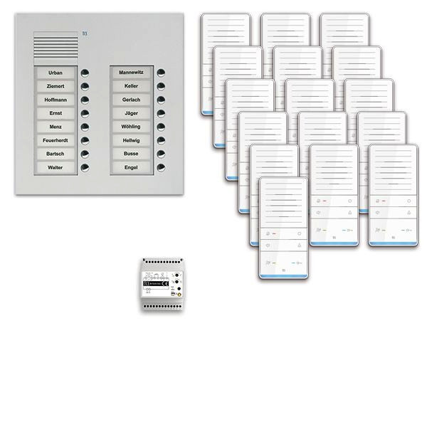 Vorkonfiguriertes Paket für 16 Wohneinheiten für den TCS:BUS bestehend aus: 1x Außenstation PUK 16Tasten 2Spalten UP EN, Artikelnummer: PUK16/2-EN, vorprogrammiert, 16x TASTA Freisprecher AUDIO PLUS WS, Artikelnummer: ISW6031-0145, 1x Vers. + Steuerg. BVS20 1Strang 4TE, Artikelnummer: BVS20-SG, Das Paket ist ab Werk vorkonfiguriert und bedingt erweiterbar, Die Funktionen der Innen- und Außenstationen können mit TCS-Serviceprodukten bedingt verändert werden, Die Komponenten unterstützen einen stand-alone-Betrieb