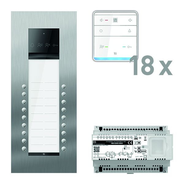 Vorkonfiguriertes Paket für 18 Wohneinheiten für den TCS:BUS bestehend aus: 1x PES PRO Audio Außenstation 18T UP ES Artikelnummer: ASU600218-0030, vorprogrammiert, 18x TASTA PRO Freisprecher 6Tasten AP WS SDI, Artikelnummer: ISW6010-0145, 1x Versorgungs- und Steuergerät Video 8 TE, Artikel-Nr. NBV2600-0400. Das Paket ist ab Werk vorkonfiguriert und bedingt erweiterbar. Die Funktionen der Innen- und Außenstationen können mit TCS-Serviceprodukten bedingt verändert werden