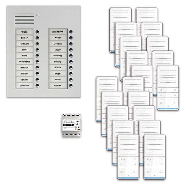 Vorkonfiguriertes Paket für 20 Wohneinheiten für den TCS:BUS bestehend aus: 1x Außenstation PUK 20Tasten 2Spalten UP EN, Artikelnummer: PUK20/2-EN, vorprogrammiert, 20x TASTA Freisprecher AUDIO PLUS WS, Artikelnummer: ISW6031-0145, 1x Vers. + Steuerg. BVS20 1Strang 4TE, Artikelnummer: BVS20-SG, Das Paket ist ab Werk vorkonfiguriert und bedingt erweiterbar, Die Funktionen der Innen- und Außenstationen können mit TCS-Serviceprodukten bedingt verändert werden, Die Komponenten unterstützen einen stand-alone-Betrieb