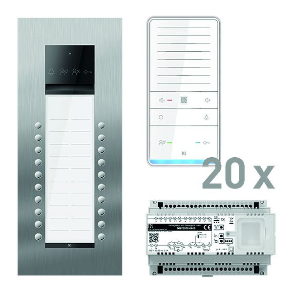 Vorkonfiguriertes Paket für 20 Wohneinheiten für den TCS:BUS bestehend aus: 1x PES PRO Audio Außenstation 20T UP ES, Artikelnummer: ASU600220-0030, vorprogrammiert, 20x TASTA Pro Freisprecher PLUS WS SDI, Artikelnummer: ISW6031-0145, 1x Versorgungs- und Steuergerät Video 8 TE, Artikel-Nr. NBV2600-0400. Das Paket ist ab Werk vorkonfiguriert und bedingt erweiterbar. Die Funktionen der Innen- und Außenstationen können mit TCS-Serviceprodukten bedingt verändert werden