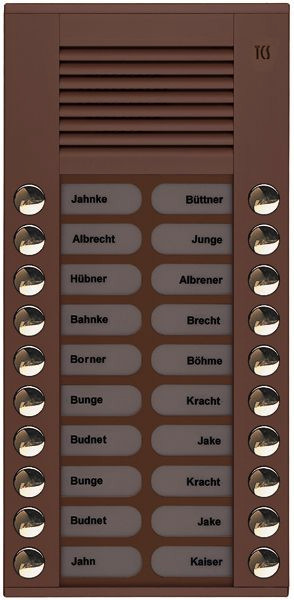 integrierte Klingeltastenverdrahtung, Metallklingelknöpfe mit vergoldeten und wartungsfreien Tastenkontakten, langlebige Namensschildbeleuchtung durch Leuchtdioden, langlebige Namensschildabdeckung aus 5 mm dickem Kunststoffglas, Namensschildgröße 41 x 15 mm, beliebige Klingeltaste als Lichtschalttaste nutzbar, Lichtsymbole liegt bei, Kontrollton für den Besucher beim Drücken der Klingeltaste, sehr einfache Montage und Installation, Temperaturbereich: -20 Grad C bis +50 Grad C, mit Mikrofon, Lautsprecher und Elektronik für einfachen Anschluss an den TCS:BUS, gute Sprachqualität, Lautstärke und Mikrofonempfindlichkeit einstellbar, für den Anschluss weiterer Klingeltastenerweiterungen vorbereitet, Farbe: Aluminium eloxiert bronze, Abmessungen: 280 x 135 x 20 mm