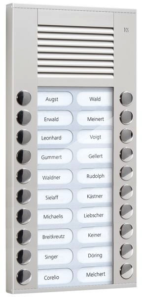 integrierte Klingeltastenverdrahtung, Metallklingelknöpfe mit vergoldeten und wartungsfreien Tastenkontakten, langlebige Namensschildbeleuchtung durch Leuchtdioden, langlebige Namensschildabdeckung aus 5 mm dickem Kunststoffglas, Namensschildgröße 41 x 15 mm, beliebige Klingeltaste als Lichtschalttaste nutzbar, Lichtsymbole liegt bei, Kontrollton für den Besucher beim Drücken der Klingeltaste, sehr einfache Montage und Installation, Temperaturbereich: -20 Grad C bis +50 Grad C, mit Mikrofon, Lautsprecher und Elektronik für einfachen Anschluss an den TCS:BUS, gute Sprachqualität, Lautstärke und Mikrofonempfindlichkeit einstellbar, für den Anschluss weiterer Klingeltastenerweiterungen vorbereitet, Farbe: Aluminium eloxiert natur, Abmessungen: 280 x 135 x 20 mm