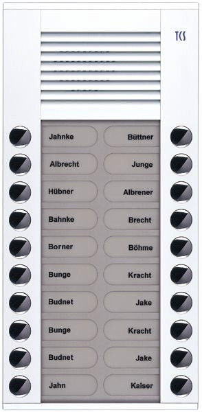 integrierte Klingeltastenverdrahtung, Metallklingelknöpfe mit vergoldeten und wartungsfreien Tastenkontakten, langlebige Namensschildbeleuchtung durch Leuchtdioden, langlebige Namensschildabdeckung aus 5 mm dickem Kunststoffglas, Namensschildgröße 41 x 15 mm, beliebige Klingeltaste als Lichtschalttaste nutzbar, Lichtsymbole liegt bei, Kontrollton für den Besucher beim Drücken der Klingeltaste, sehr einfache Montage und Installation, Temperaturbereich: -20 Grad C bis +50 Grad C, mit Mikrofon, Lautsprecher und Elektronik für einfachen Anschluss an den TCS:BUS, gute Sprachqualität, Lautstärke und Mikrofonempfindlichkeit einstellbar, für den Anschluss weiterer Klingeltastenerweiterungen vorbereitet, Farbe: weiß lackiert, RAL 9010, Abmessungen: 280 x 135 x 20 mm