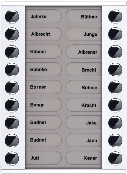 Integrierte Elektronik- und Klingeltastenverdrahtung, Anschluss über Verbindungsleitung an PES-Außenstation, für den Anschluss weiterer Klingeltastenerweiterungen vorbereitet, Namensschildgröße 41 x 15 mm, Farbe: weiß lackiert, RAL 9010, Abmessungen: 185 x 135 x 20 mm