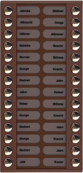 Integrierte Elektronik- und Klingeltastenverdrahtung, Anschluss über Verbindungsleitung an PES-Außenstation, für den Anschluss weiterer Klingeltastenerweiterungen vorbereitet, Namensschildgröße 41 x 15 mm, Farbe: Aluminium eloxiert bronze, Abmessungen: 280 x 135 x 20 mm