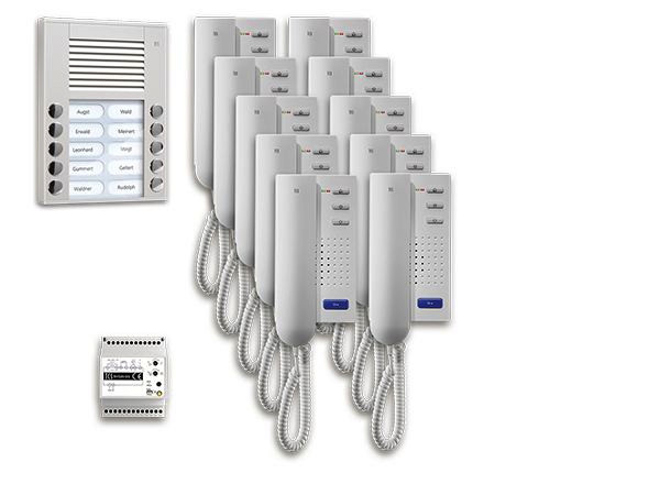 Vorkonfiguriertes Paket für 10 Wohneinheiten für den TCS:BUS bestehend aus: 1x Außenstation PES 10Tasten AP EN LED WS, Artikelnummer: PES10-EN/04, vorprogrammiert, 10x Türtelefon 4Tasten WS, Artikelnummer: ISH3030-0140, 1x Vers. + Steuerg. BVS20 1Strang 4TE, Artikelnummer: BVS20-SG, Das Paket ist ab Werk vorkonfiguriert und bedingt erweiterbar. Die Funktionen der Innen- und Außenstationen können mit TCS-Serviceprodukten bedingt verändert werden, Die Komponenten unterstützen einen stand-alone-Betrieb