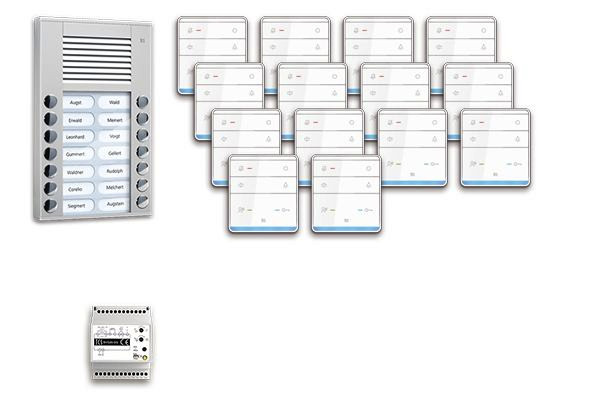 Vorkonfiguriertes Paket für 14 Wohneinheiten für den TCS:BUS bestehend aus: 1x Außenstation PES 14Tasten AP EN LED WS, Artikelnummer: PES14-EN/04, vorprogrammiert, 14x TASTA Freisprecher 6Tasten AP WS, Artikelnummer: ISW6010-0145, 1x Vers. + Steuerg. BVS20 1Strang 4TE, Artikelnummer: BVS20-SG, Das Paket ist ab Werk vorkonfiguriert und bedingt erweiterbar, Die Funktionen der Innen- und Außenstationen können mit TCS-Serviceprodukten bedingt verändert werden, Die Komponenten unterstützen einen stand-alone-Betrieb