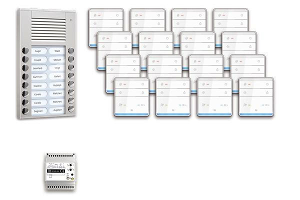 Vorkonfiguriertes Paket für 16 Wohneinheiten für den TCS:BUS bestehend aus: 1x Außenstation PES 16Tasten AP EN LED WS, Artikelnummer: PES16-EN/04, vorprogrammiert, 16x TASTA Freisprecher 6Tasten AP WS, Artikelnummer: ISW6010-0145, 1x Vers. + Steuerg. BVS20 1Strang 4TE, Artikelnummer: BVS20-SG, Das Paket ist ab Werk vorkonfiguriert und bedingt erweiterbar, Die Funktionen der Innen- und Außenstationen können mit TCS-Serviceprodukten bedingt verändert werden, Die Komponenten unterstützen einen stand-alone-Betrieb