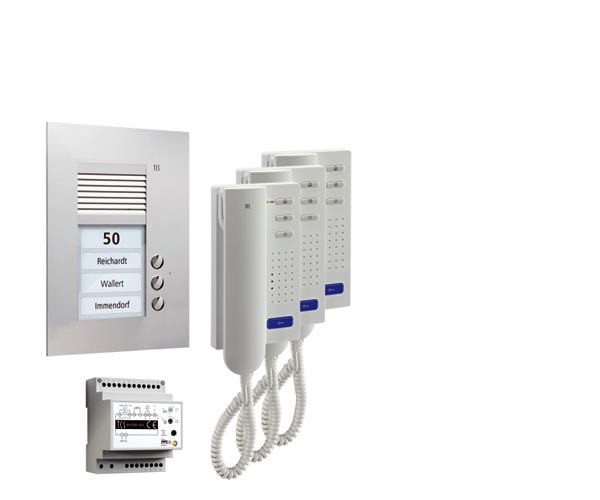 pre:pack3 Unterputz, bestehend aus bereits vorkonfigurierten TCS-Grundkomponenten: 1x Außenstation PUK03/1 EN/P, 3x Türtelefone ISH3030 (vorkonfiguriert), 1x Steuergerät BVS20-SG