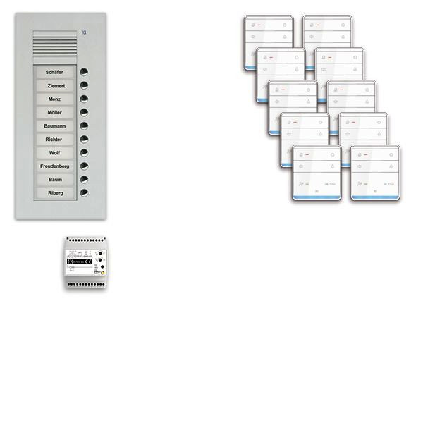 Vorkonfiguriertes Paket für 10 Wohneinheiten für den TCS:BUS bestehend aus: 1x Außenstation PUK 10Tasten 1Spalte UP EN, Artikelnummer: PUK10/1-EN, vorprogrammiert, 10x TASTA Freisprecher 6Tasten AP WS, Artikelnummer: ISW6010-0145, 1x Vers. + Steuerg. BVS20 1Strang 4TE, Artikelnummer: BVS20-SG, Das Paket ist ab Werk vorkonfiguriert und bedingt erweiterbar, Die Funktionen der Innen- und Außenstationen können mit TCS-Serviceprodukten bedingt verändert werden, Die Komponenten unterstützen einen stand-alone-Betrieb