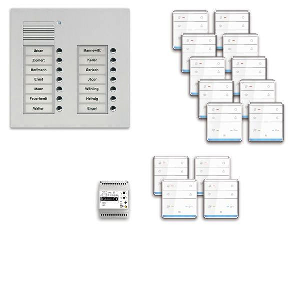 Vorkonfiguriertes Paket für 14 Wohneinheiten für den TCS:BUS bestehend aus: 1x Außenstation PUK 14Tasten 2Spalten UP EN, Artikelnummer: PUK14/2-EN, vorprogrammiert, 14x TASTA Freisprecher 6Tasten AP WS, Artikelnummer: ISW6010-0145, 1x Vers. + Steuerg. BVS20 1Strang 4TE, Artikelnummer: BVS20-SG, Das Paket ist ab Werk vorkonfiguriert und bedingt erweiterbar, Die Funktionen der Innen- und Außenstationen können mit TCS-Serviceprodukten bedingt verändert werden, Die Komponenten unterstützen einen stand-alone-Betrieb
