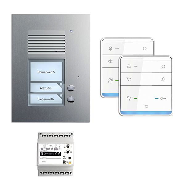 Vorkonfiguriertes Paket für 2 Wohneinheiten für den TCS:BUS bestehend aus: 1x Außenstation PUK 2Tasten 1 Spalte UP EN, Artikelnummer: PUK02/1-EN, vorprogrammiert, 2x TASTA Freisprecher 6Tasten AP WS, Artikelnummer: ISW6010-0145, 1x Vers. + Steuerg. BVS20 1Strang 4TE, Artikelnummer: BVS20-SG, Das Paket ist ab Werk vorkonfiguriert und bedingt erweiterbar, Die Funktionen der Innen- und Außenstationen können mit TCS-Serviceprodukten bedingt verändert werden, Die Komponenten unterstützen einen stand-alone-Betrieb