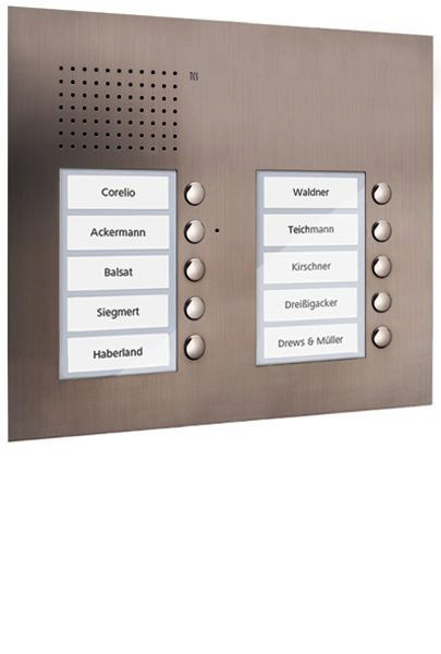 für 10 Wohneinheiten, Unterputzmontage, Frontplatte 3 mm, win:clip-Prinzip, Namensfeldgröße: H 19 mm x B 62 mm, Metallklingelknöpfe mit vergoldeten, wartungsfreien Kontakten, langlebige und energiesparende Namens- / Infoschildbeleuchtung, bruchsicheres Namensschildglas, Quittungston beim Drücken der Klingeltaste, Sprechgitter gelocht, Frontplatte: Edelstahl geschliffen, 3-Draht-Technik erforderlich, zulässige Umgebungstemperatur: -20 Grad C bis 50 Grad C, Maße Frontplatte: H 230 mm x B 274 mm x T 3 mm, Maße UP-Kasten: H 181 mm x B 250 mm x T 40 mm