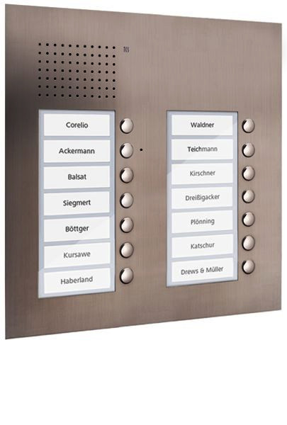 für 14 Wohneinheiten, Unterputzmontage, Frontplatte 3 mm, win:clip-Prinzip, Namensfeldgröße: H 19 mm x B 62 mm, Metallklingelknöpfe mit vergoldeten, wartungsfreien Kontakten, langlebige und energiesparende Namens- / Infoschildbeleuchtung, bruchsicheres Namensschildglas, Quittungston beim Drücken der Klingeltaste, Sprechgitter gelocht, Frontplatte: Edelstahl geschliffen, 3-Draht-Technik erforderlich, zulässige Umgebungstemperatur: -20 Grad C bis 50 Grad C, Maße Frontplatte: H 274 mm x B 274 mm x T 3 mm, Maße UP-Kasten: H 225 mm x B 250 mm x T 40 mm